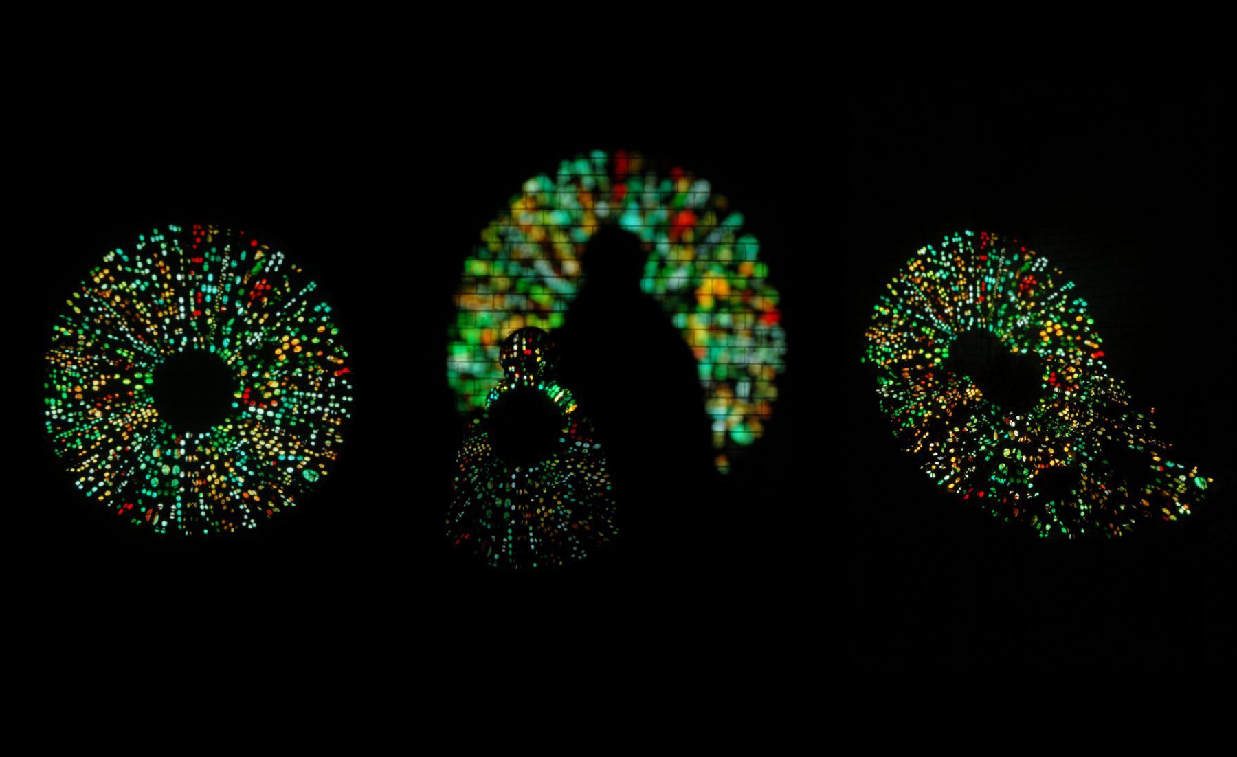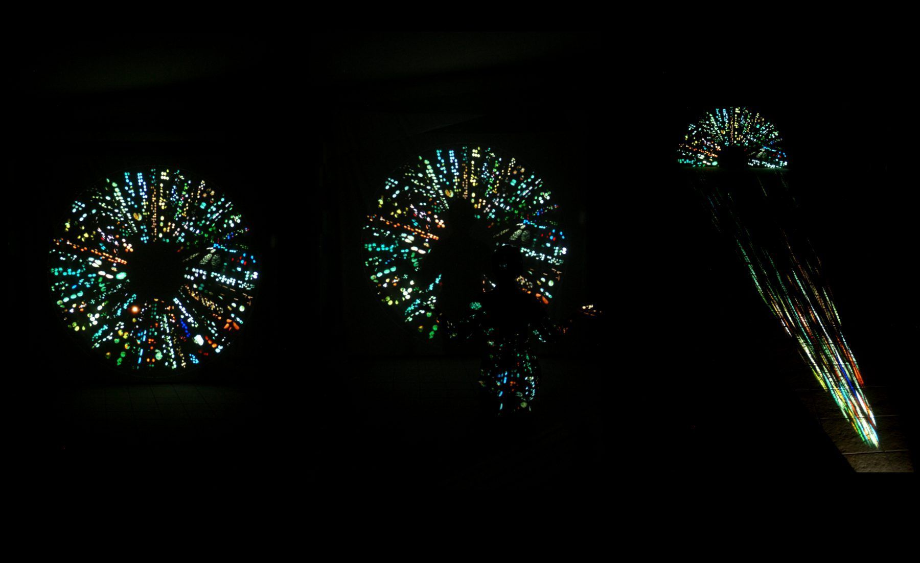 The subsequent composition of the images gives rise to an eye that represents the transforming power of perception: on the one hand, the eye appears in a shape of its own, depending on the shape and color of the illuminated surfaces. On the other hand it gives a new form to the spaces it illuminates. An eye is been thrown onto reality and arbitrarily changes it.