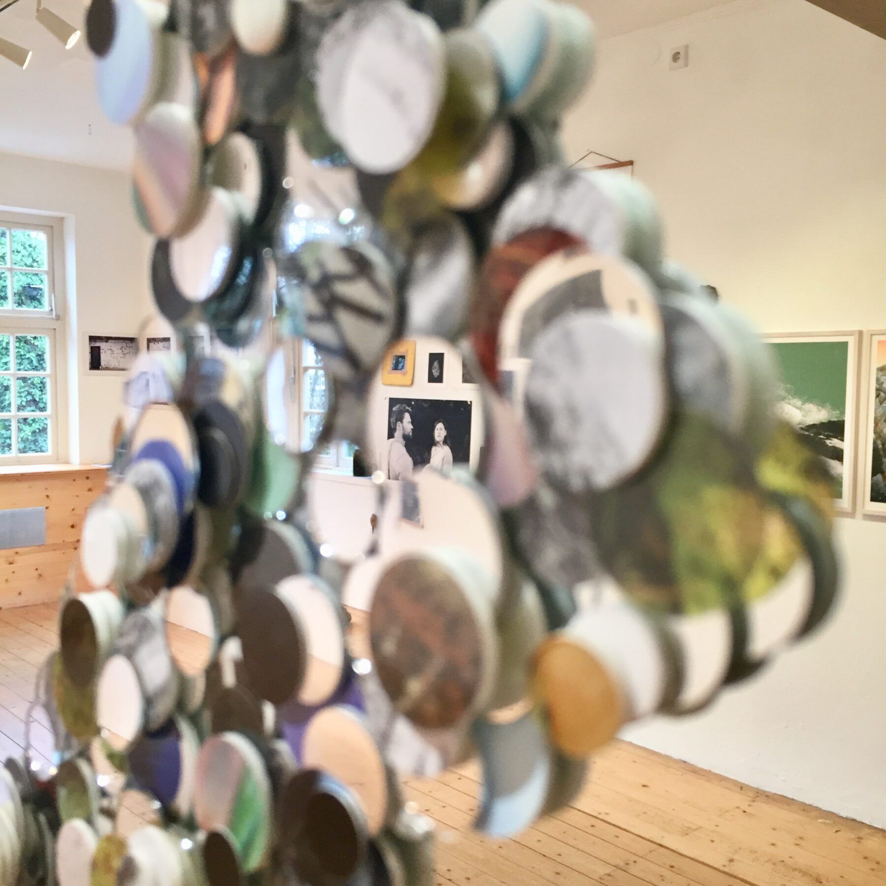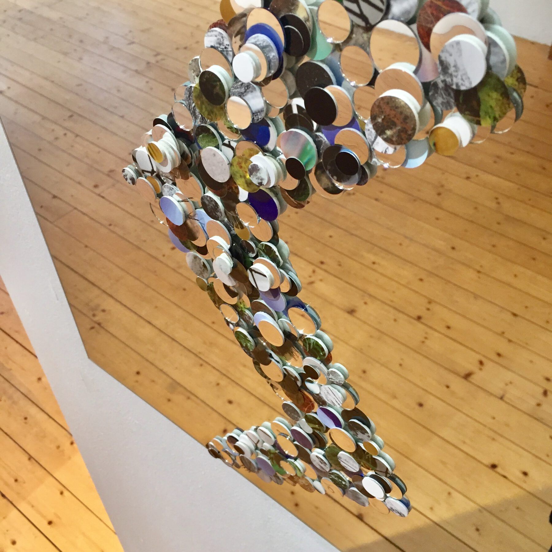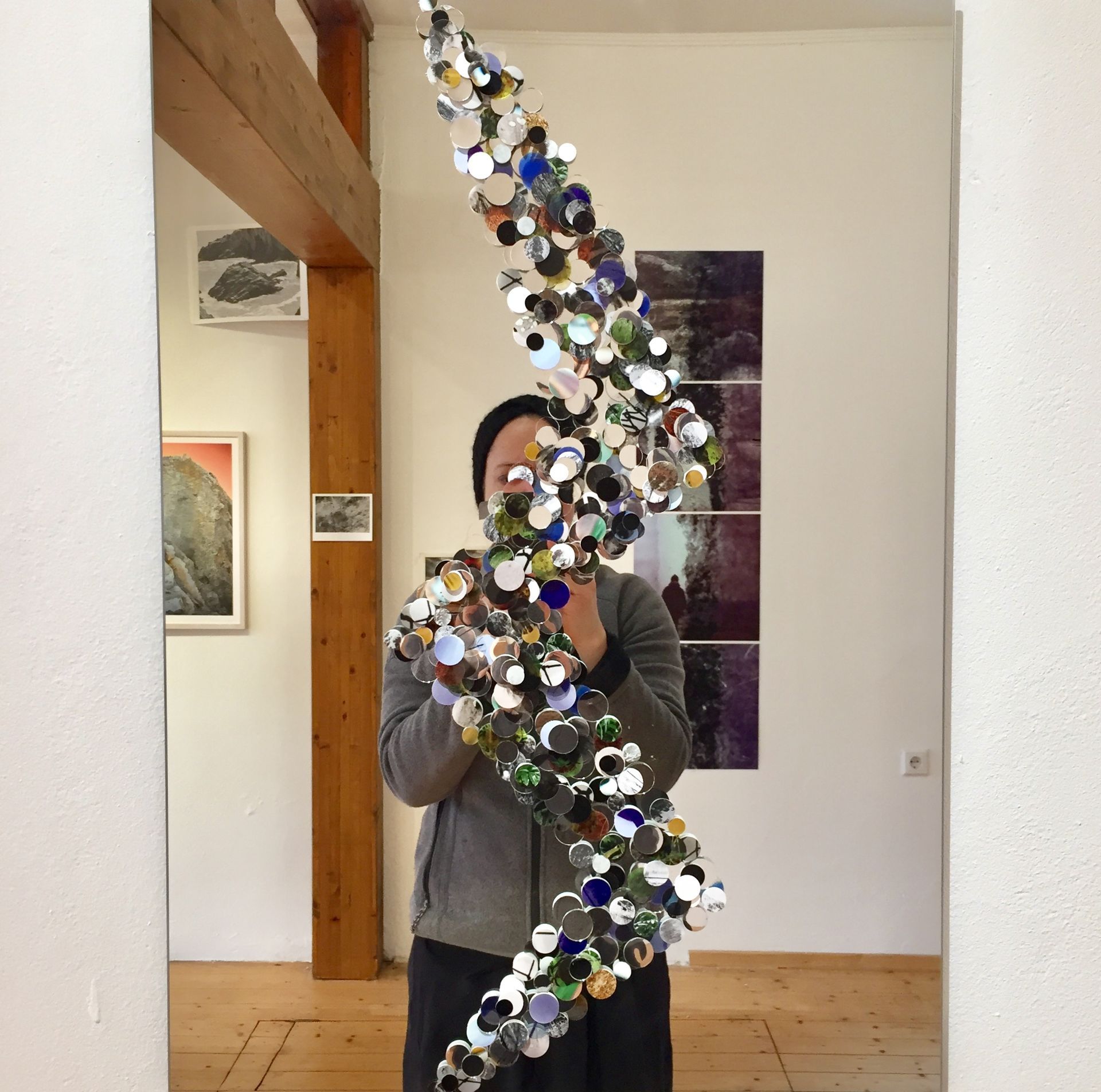For the first time in this project the 845 dots of the 34 synonyms of the word to see in Braille were used without following the structure of the respective word. Nevertheless, they accommodate the words. The amalgam of a flash, a crack and a fissure was created as part of a group exhibition with works by Lena Gudd, Simon Sola Holischka and Anna Heydel and is based on photographs by all three exhibitors. The images, printed on both paper and transparent film, were dotted and applied to a mirror together with round mirrors and dots of mirror film, following the shape of the structure. The developing sculpture emerges from this reality as a transformed reality and also irritates its viewers in the reflective surfaces.